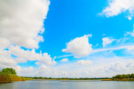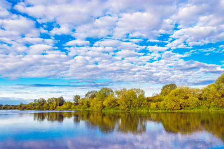 Beautiful summer nature landscape with a lake under a blue sky with white cumulus clouds reflecting in the clear water of the lake.