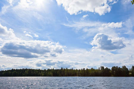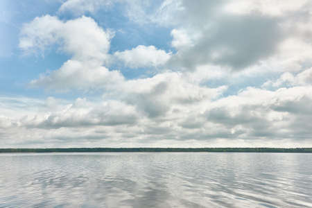 Summer landscape: the sky with clouds and the forest on the horizon are reflected in the clear water of the lake. Copspace. The concept of a relaxing holiday, the beauty of nature.