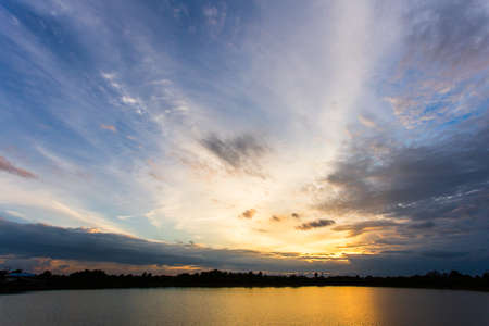 Sunset sky background. Dramatic gold sunset with evening sky clouds over the lake. Stunning sky clouds in the sunrise. Sky landscape. Panoramic view. Summer landscape