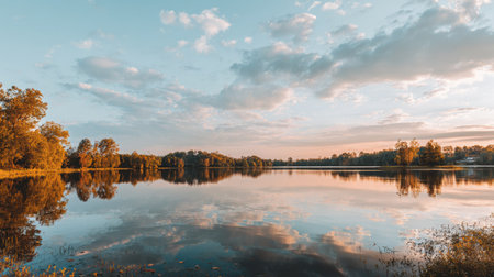 Discover a peaceful autumn landscape featuring a calm lake, vibrant reflections, and a beautiful sky with clouds, perfect for nature lovers and outdoor enthusiasts.