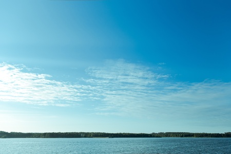 blue sky with spindrift clouds over lake and forest on horizon at September sunset