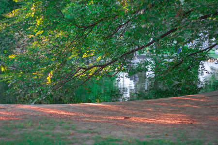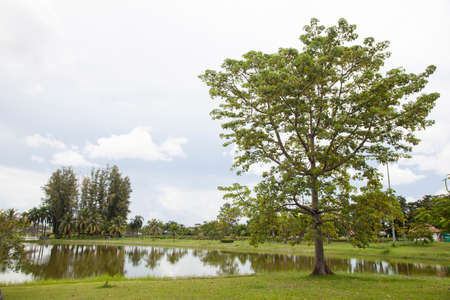Public park with trees , river and sky background in city.Beautiful green park in the city on one morning