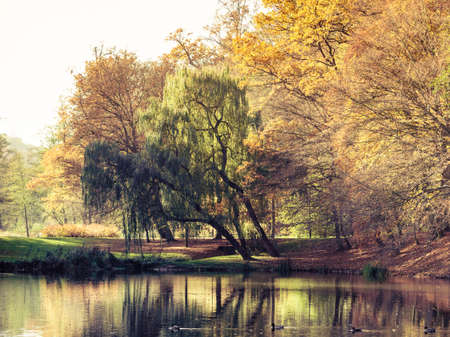 Autumnal landscape. Autumn park with pond or river and weeping willow colorful trees on the shore