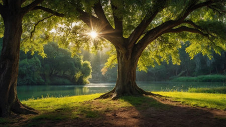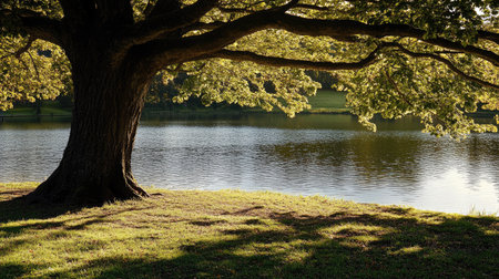 A large tree casting its shadow on a peaceful lake's edge, with space for text