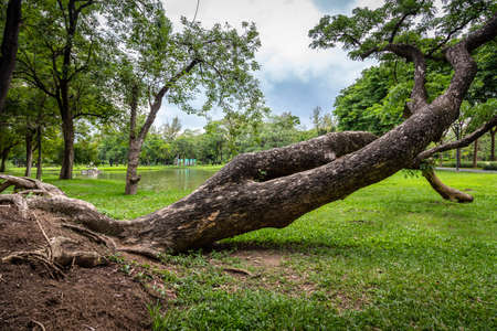Broken tree is falling down in outdoor park,uprooted tree fell after heavy storm,thunderstorm in rainy season,the large storm ripped large trees from roots with high winds,natural disaster in Bangkok,Thailand