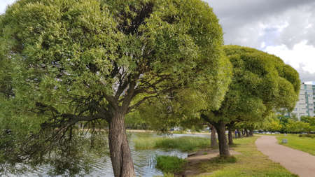 Russia, St. Petersburg 11,09,2018 trimmed trees and alleys in a lake park in summer