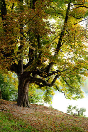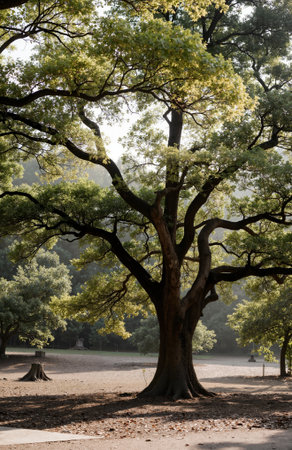 Beautiful old oak tree in the park at morning time, South Korea.
