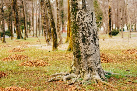 Mighty roots of trees. Trees in the autumn forest.