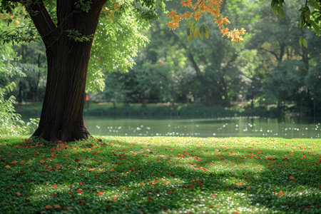 Tree Trunk and Fallen Leaves in a Green Park with a Pond in the Background