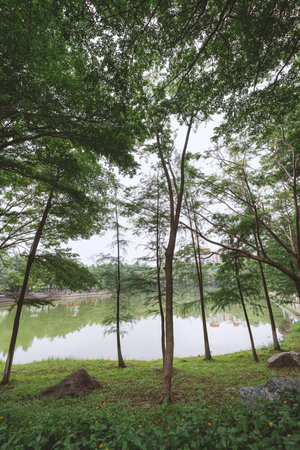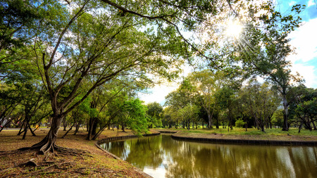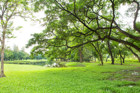 Beautiful park with pond and green trees in the morning