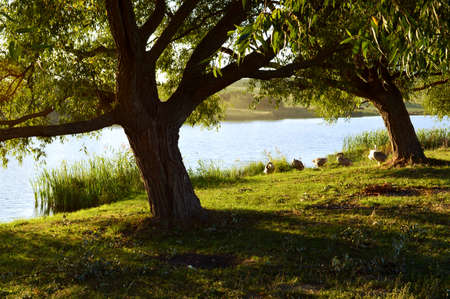 Summer or early autumn park with pond or river and weeping willow trees on the shore.