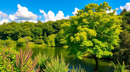 Beautiful spring landscape with green trees, lake and blue sky.