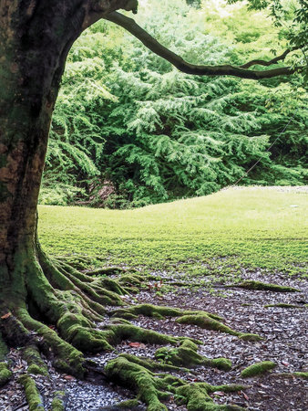 Lush green landscape with moss-covered tree roots in a serene environment
