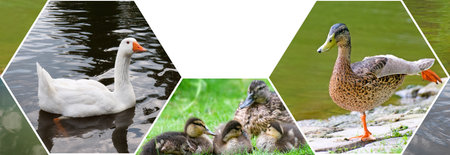 A creative collage featuring a goose, a mallard duck, and cute ducklings. This photo montage captures different moments of bird life in nature, with ample copy space.