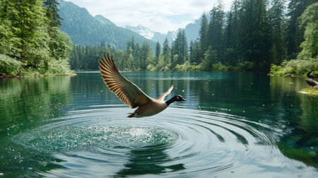 Cute wild ducks splash in the water of a lake near the sunny shoreline on a summer day. Nature and the joy of these ducks as they freely enjoy their natural habitat. Wildlife and the natural world.