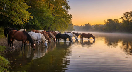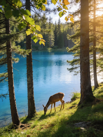 Deer in the forest on the shore of the lake. Autumn landscape.