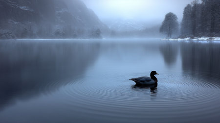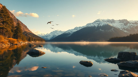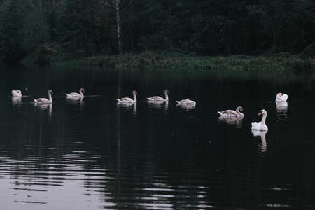Tranquil Scene of a Swan Family Swimming on a Lake at autumn time.