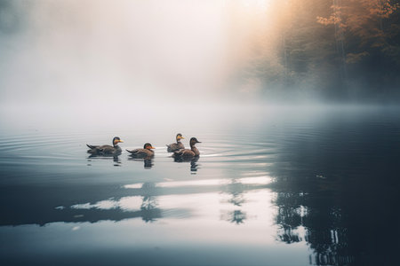 Ducks swimming on the lake at sunrise. Beautiful autumn landscape.