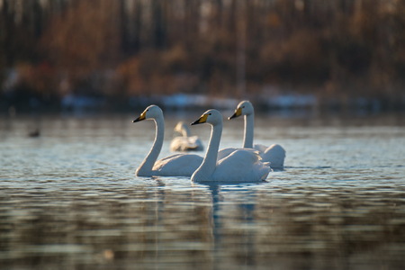 Beautiful white whooping swans swimming in the nonfreezing winter lake. The place of wintering of swans, Altay, Siberia, Russia.