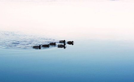 Ducks swim on winter lake. The lake reflected the pale pink sky.