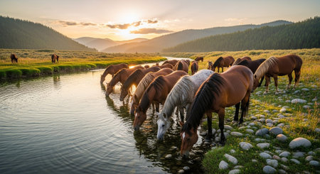 A bear forages in a serene lake surrounded by stunning mountains and lush forests during sunset.