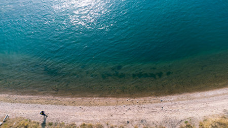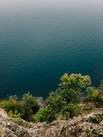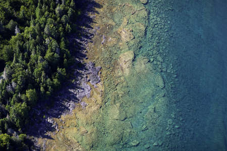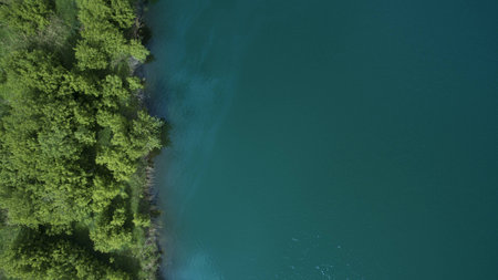 Deep blue lake water surface meeting rocky cliff with green trees growing on it, aerial view of beautiful nature creating abstract patterns. Rocky cliff edge, blue lake, green trees fringing shoreline