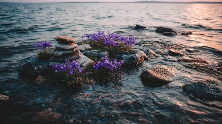 Wildflowers bloom on a cluster of rocks surrounded by water. The image displays a tranquil scene, showcasing purple flowers and stacked stones. The composition suggests an outdoor setting during the day, with soft lighting enhancing the textures of the rocks and water. Suitable for nature-related content and tranquil themes.