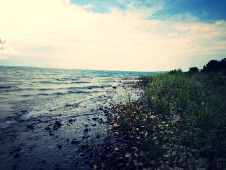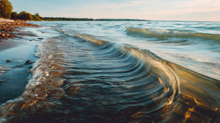 A tranquil shoreline scene featuring gentle waves lapping against a pebbled beach under soft evening light. Serenity and natural beauty combine.