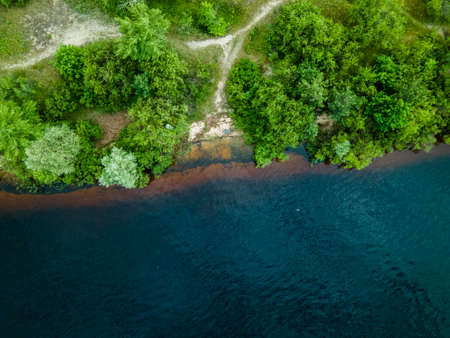 Aerial view of a forest lake. Drone photography. Forest and lake border. Coastline view from the drone.