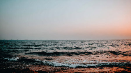 A tranquil ocean scene at dusk. Gentle waves ripple across the water, reflecting the soft, warm colors of the sunset sky. A peaceful and calming natural landscape.