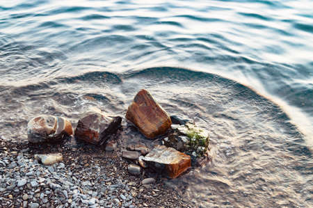 Boulders and rocks on sea shore washed with waves and causing ripples on water surface