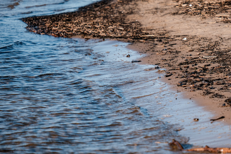 Waves of dark water washing the shore of the lake in the park. Media. Autumn background.
