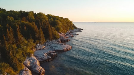 the shoreline is a picturesque sight with a mix of deciduous trees and firs. the rainy weather adds to the charm of the photo, creating a serene atmosphere around the area. the tops of the trees can be seen, adding to the depth of the photo. ai generated