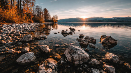 This captivating image displays a stunning sunset over a calm lake, framed by rocky shorelines and vibrant autumn foliage, creating a peaceful landscape.