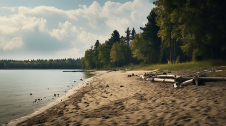 a beach scene featuring branches scattered along the shore. the photo showcases a dark green and beige color palette, with a cabincore aesthetic. captured in 32k uhd resolution, this national geographic photo by wiesaw wakuski embodies the forestpunk genre. the selective focus adds depth and visual interest to the composition. ai generated