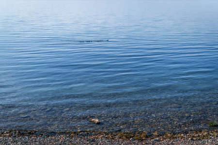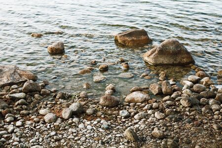 Small boulders submerged in water of a lake on a lakeshore in summer, detail, background