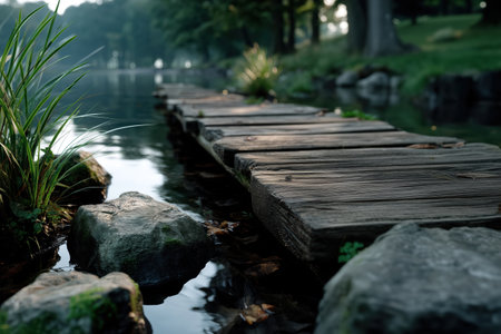 Old vintage wooden bridge on the lake, in spring, tropical, quiet river. Generative AI.