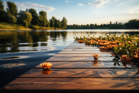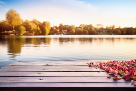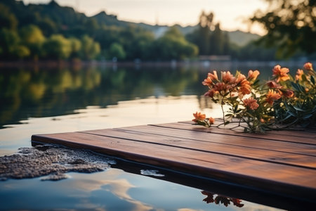 Wooden deck table with blurred lake background professional photography