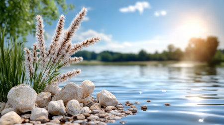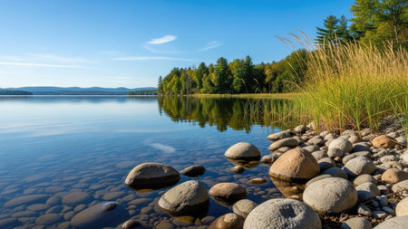 A picturesque view showcases a serene lake with a rocky shoreline. The water reflects the surrounding trees and the clear blue sky above. The scene is bathed in natural light, suggesting a daytime setting with the potential for landscape photography. Suitable for various commercial and editorial applications.
