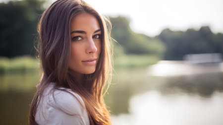 Portrait of a young beautiful brunette woman by the river