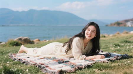 Portrait of a beautiful asian woman lying on the grass by the lake