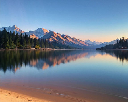 The tranquil lake mirrors surrounding mountains and lush forests, creating a perfect moment of serenity during the early morning hours. Nature invites calmness and reflection.