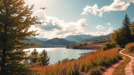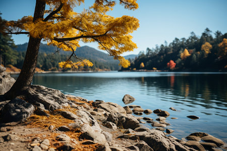 Tranquil lake reflecting the vibrant colors of autumn foliage, creating a picturesque scene of nature's beauty