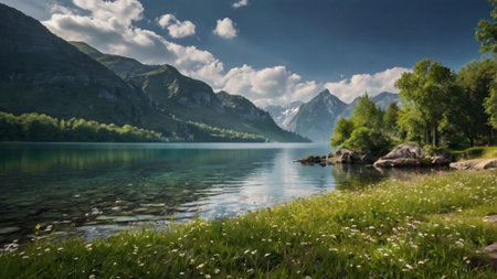 In the morning light a serene landscape unfolds, where the tranquil lake reflects the majestic mountains and their enchanting surroundings, creating a scene that feels both timeless and magical