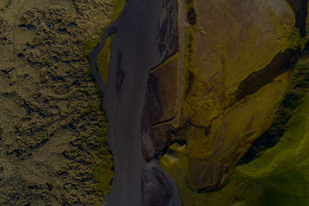 Top view of dramatic abstract icelandic glacier river delta flowing through rugged landscape in Highlands of Iceland