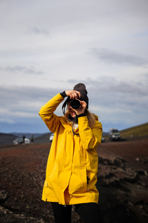 A backpacking girl taking a photo of her surroundings in the Icelandic highlands. She is wearing a yellow trekking jacket and faces the camera while holding her camera at eye level. Travel, outdoor, and nature photography. Blahylur lake, Iceland.