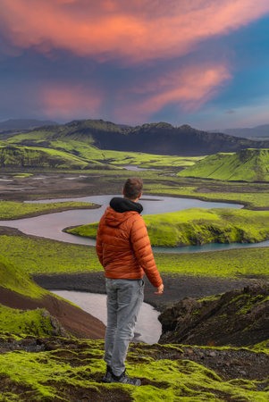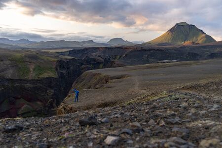 Caucasian young guy standing in over mountain and canyon background on the way of Laugavegur trail, Iceland. Promoting healthy lifestyle.