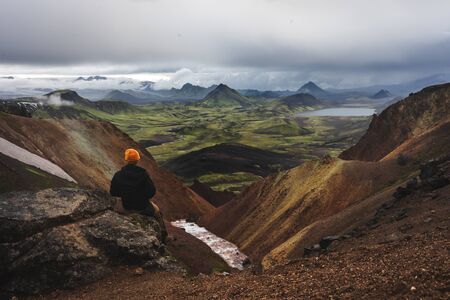 Hiker in yellow hat taking to admire landscape of Icelandic highlands August 2018