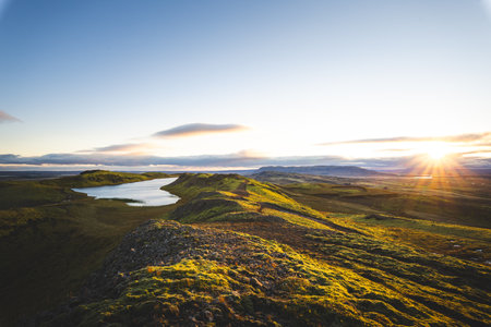 Golden hour over the rolling hills and calm lake near Midfell mountain in Hrunamannahreppur, Iceland. A peaceful sunset moment in the untouched Icelandic countryside.
