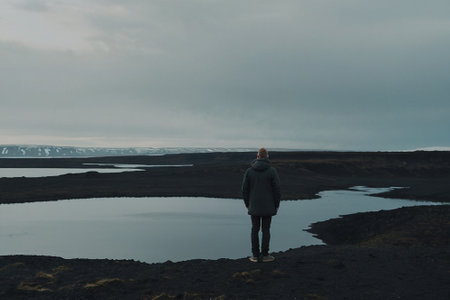 A man standing on the edge of a volcanic lake in Iceland, looking into the distance.